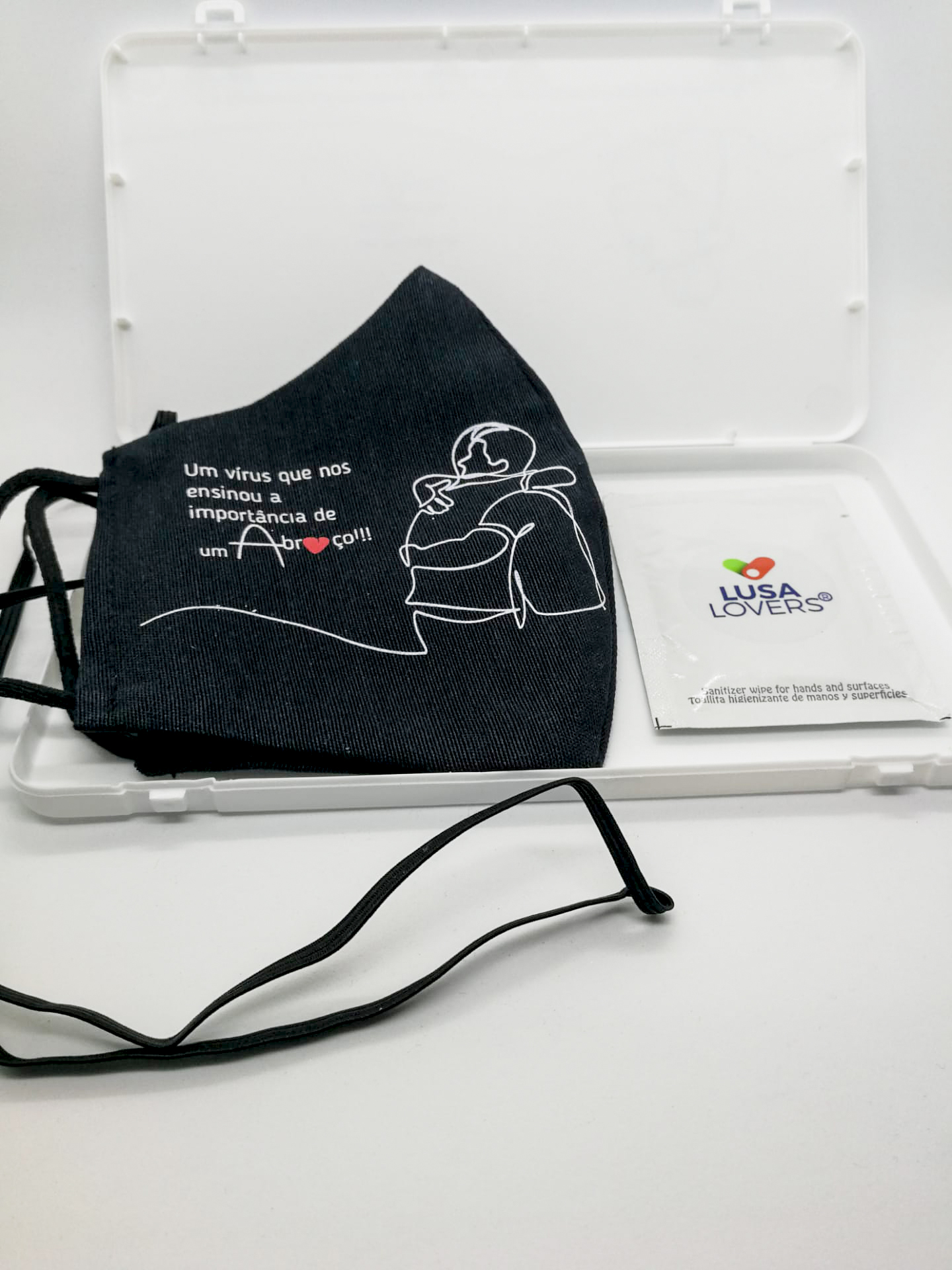 Inclui: máscara com fita de pendurar ao pescoço, caixa rígida de transporte e toalhita higienizante de mãos e superfícies.